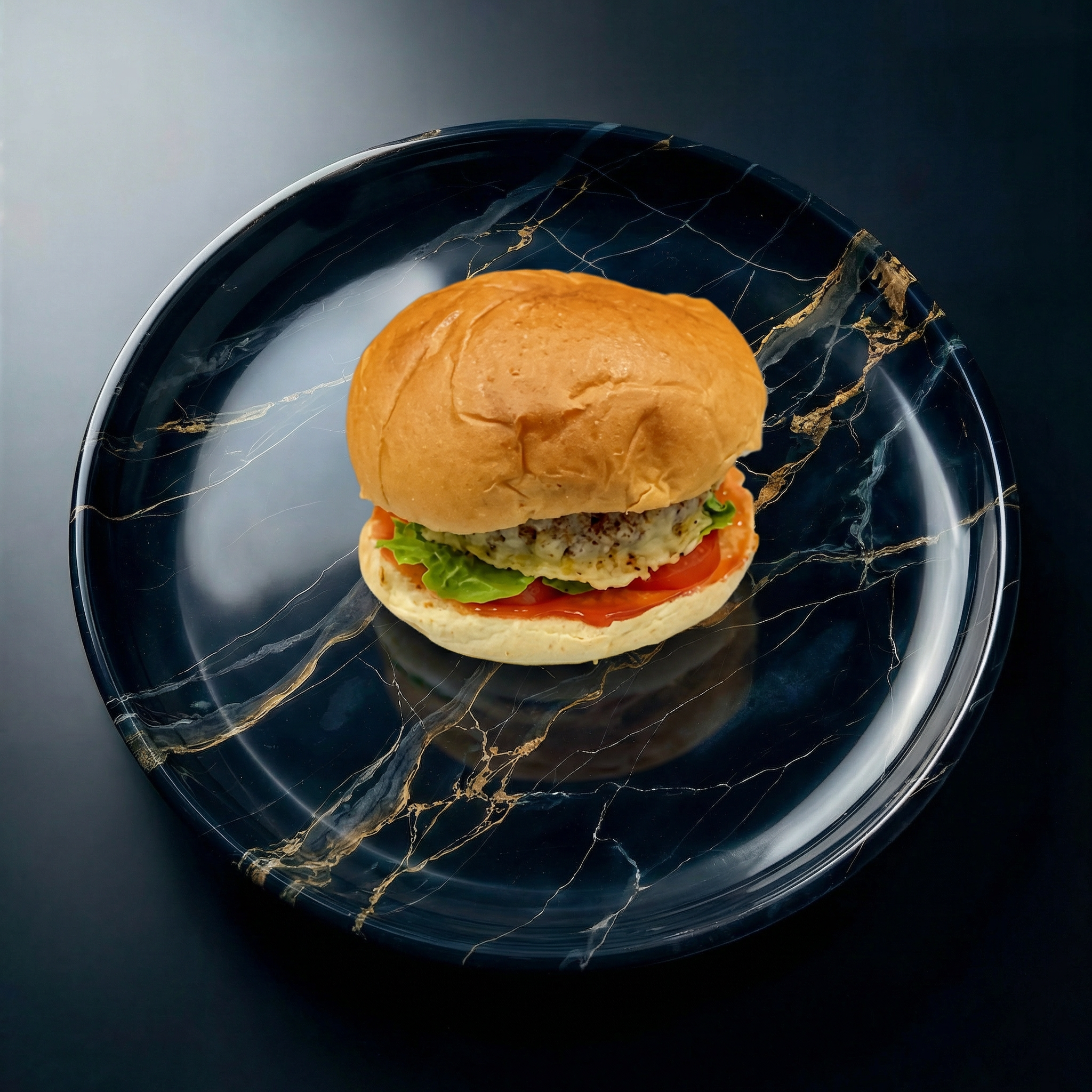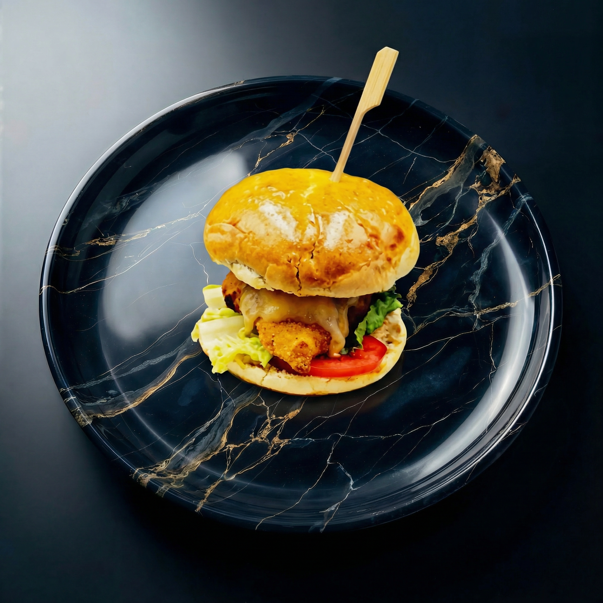 Un délicieux burger maison dans un pain brioché avec une sauce buger maison, tomate et comté. Origine France.